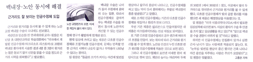 ![]() 2006년 12월 11일 중앙일보에 임승정 원장님께서 2006 대한안과학회에서 발표하신 리스토어렌즈 관한 기사가 게재되었습니다.미국에서 개발된 아크리소프 리스토어 렌즈로 저희 세란안과에서 20명의 백내장 환자를 대상으로 시술한 결과 4명 중 3명이 원거리는 물론 돋보기 없이 신문을 읽을 수 있을 정도의 근거리 시력을 회복되었습니다.아크리소프트 리스토어 렌즈에 대해서 자세한 기사내용을 원하시는 분께서는 아래의 기사전문을 참고하시기 바랍니다.고객여러분을 위하여 언제나 앞서가는 세란안과가 되기 위하여 최선의 노력을 다하겠습니다.감사합니다. 기사보러가기 |
